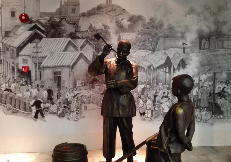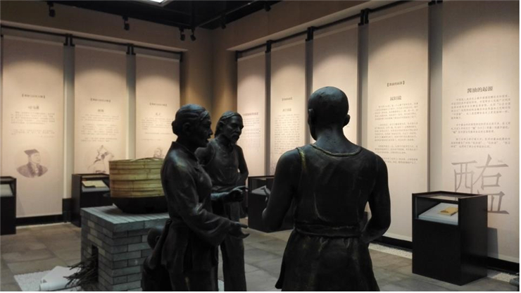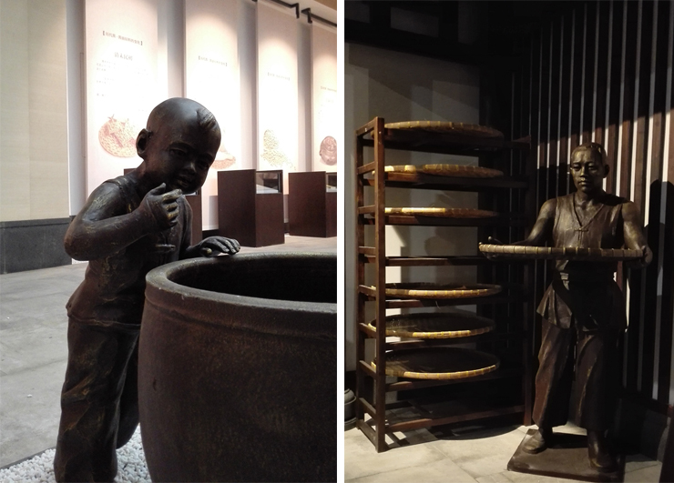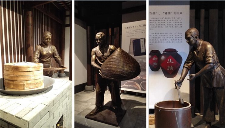三樓歷史展區實景圖,以雕塑、燈光和壁畫烘托場景,展現醬油的歷史起源。