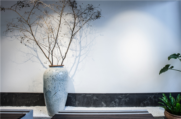 一樓上電梯處實景圖,采用騎樓作為空間隔斷,綴以景觀小品,達到室內空間室外化的效果。