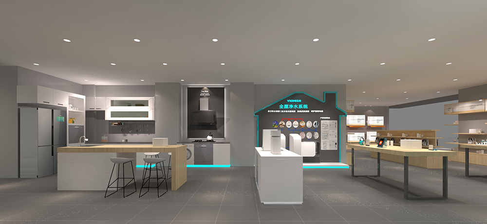 項目分為兩個分區,一個部分為小米智能產品,另外一部分為云米的凈水體驗區,體驗區則是通過廚房樣板區的搭建來實地感受凈水,而小米職能產品區則通過簡約的展示臺和背柜來展示。