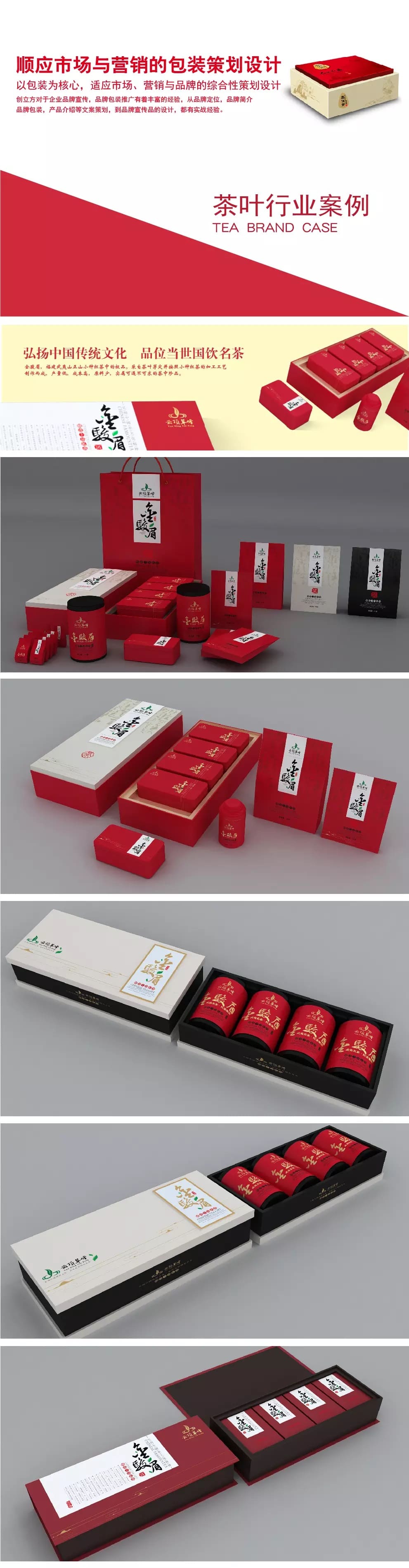 金俊眉茶葉是紅茶中的精品,此次包裝設計的主色調采用紅茶的“紅”色,體現了產品的特性,在字體設計上采用毛筆字體,體現中國風的意境。