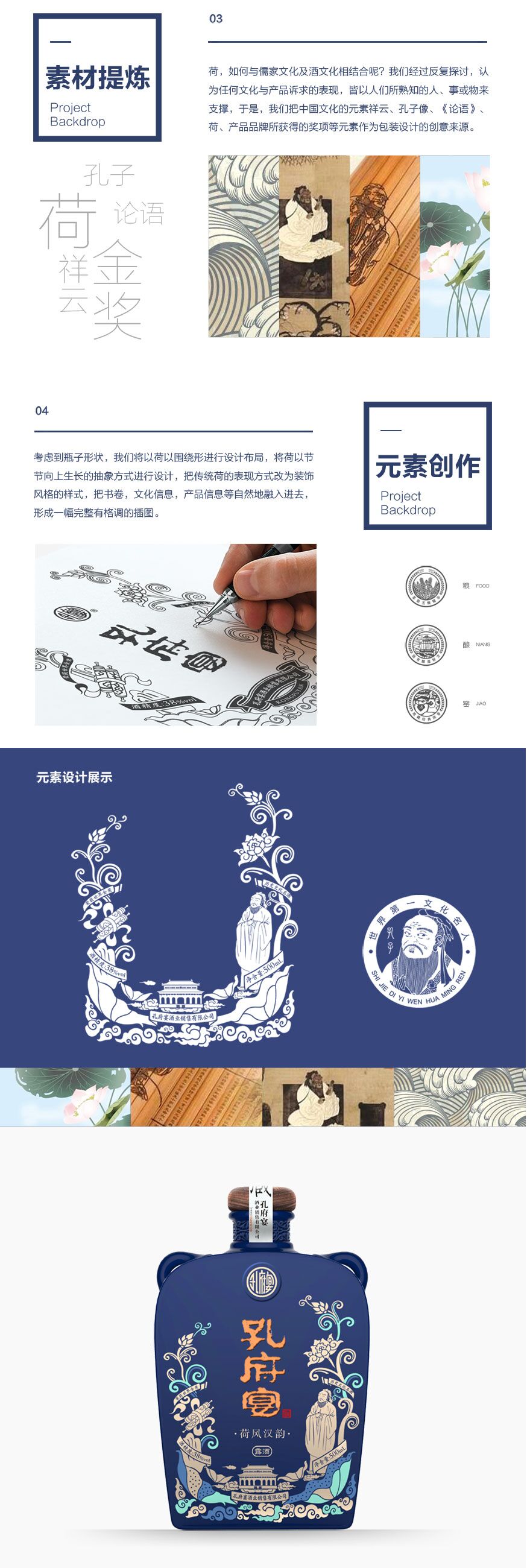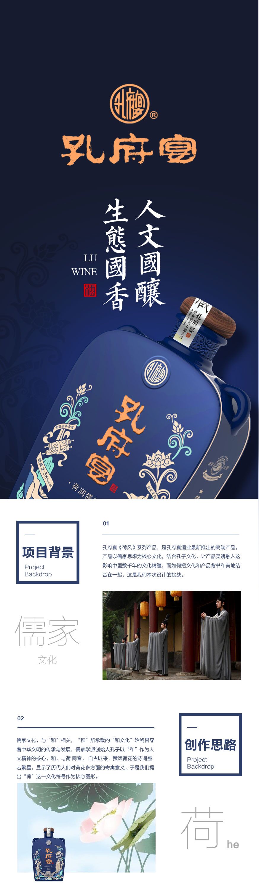孔府宴《荷風》系列產品,是孔府宴酒業新推出的高端產品,產品以儒家思想為核心文化,結合孔子文化,讓產品靈魂融入這影響中國數千年的文化精髓,而如何把文化和產品背書和美地結合在一起,這是我們本次設計的挑戰。