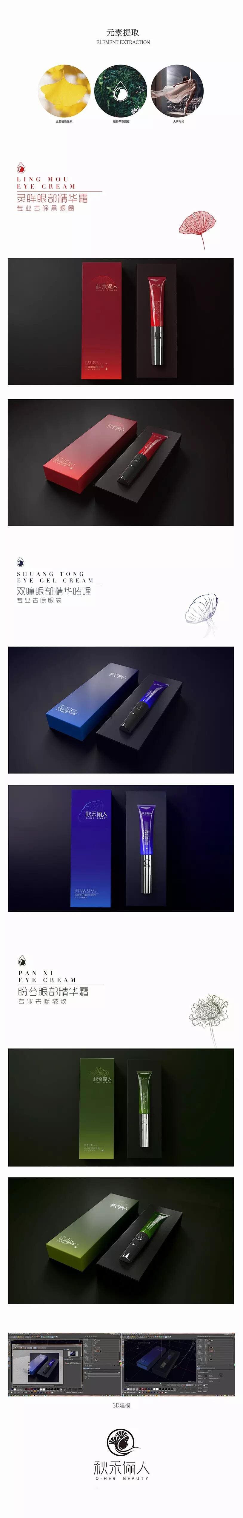 蔚派設計品牌年度合作單位,此次3個系列眼霜針對不同的功效。每個系列提取最重要的植物成分作為設計元素、結合“植物萃取”藝術圖標、采用現代簡約的風格,最后通過3D渲染呈現出產品的包裝效果。