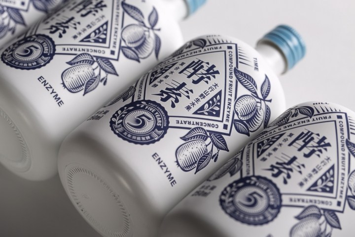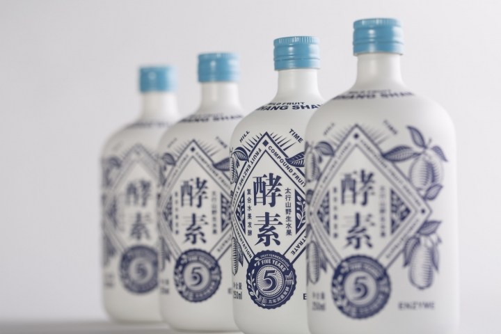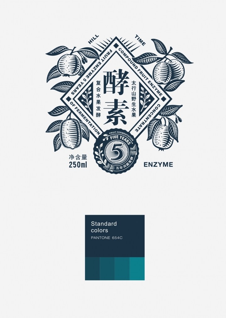 設計風格融入青花元素及有較強現代感的幾何圖形,意為傳統工藝與時尚健康的現代生活方式融合,顏色以典雅的象牙白及清新的藏藍色為主,突出水果酵素的原料純凈,自然。